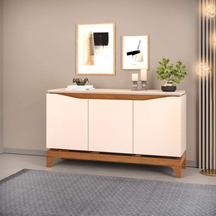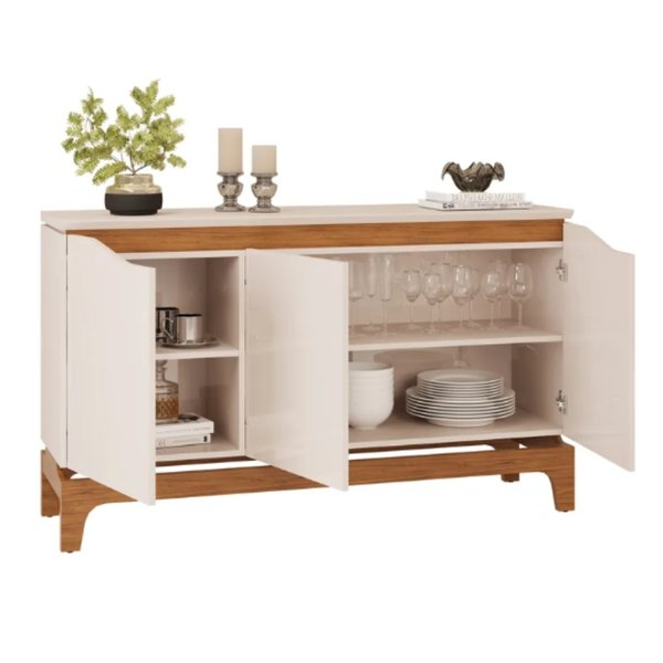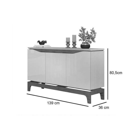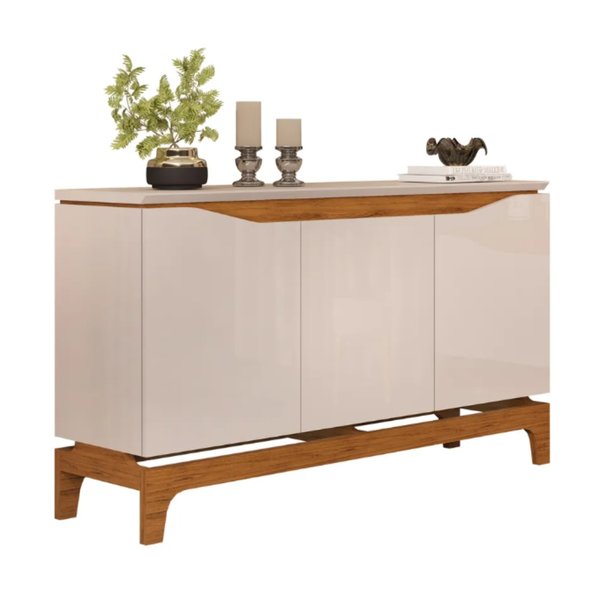 Sobre este producto: Una gran solución para tu hogar, el Nice Buffet es el complemento ideal para tu comedor. Tiene un diseño moderno y sofisticado, con una tapa con borde biselado y un espesor de 25mm, que además aporta mucha más resistencia. Con tres puertas giratorias en MDF con detalle mecanizado, así como dos estantes internos, tendrás espacio para guardar tus objetos y menaje del hogar de manera organizada, es un mueble práctico y funcional. Para crear una bonita composición en tu hogar, puedes utilizar el Buffet Nice en combinación con la Cristaleira Nice, el diseño de estos productos va de la mano. Producida con materias primas de calidad, su estructura está reforzada con pies de 25 mm y mecanizada en una geometría que crea un efecto flotante, resaltando la caja y siguiendo las tendencias de decoración más actuales, además de facilitar la limpieza.