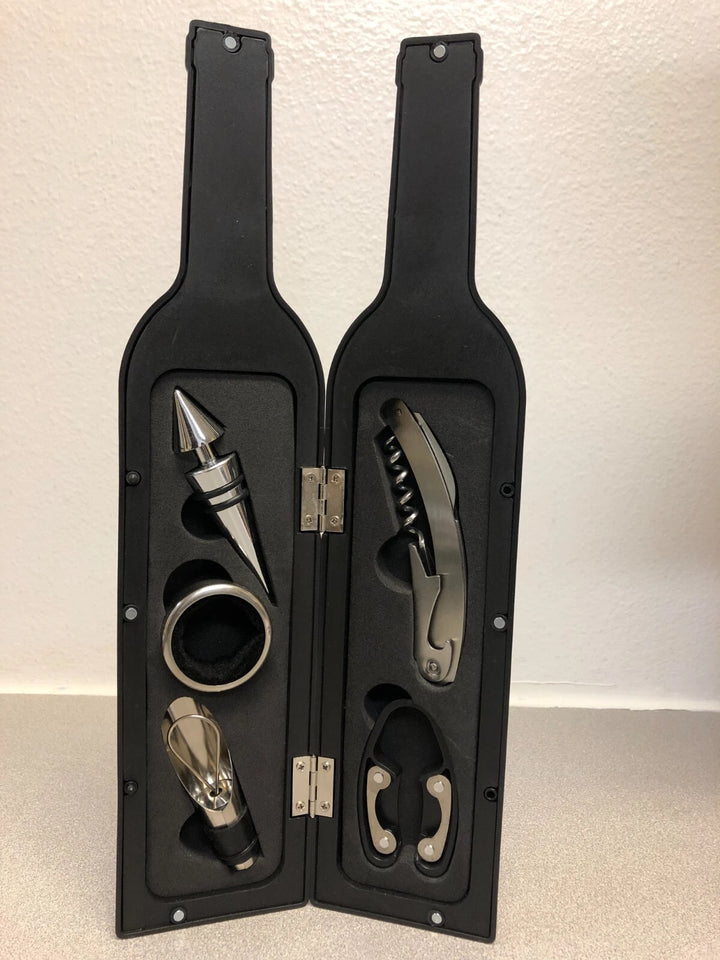 Sobre este producto: Botella de vino de plástico que se abre para revelar accesorios de cinco piezas. El juego de accesorios incluye tapón de vino, collar, aireador de vino, sacacorchos y cortador de papel de aluminio. Un divertido e innovador para almacenar y revelar tus vinos. El juego de accesorios de vino hace que abrir una botella de vino sea fácil, emocionante y entretenido.