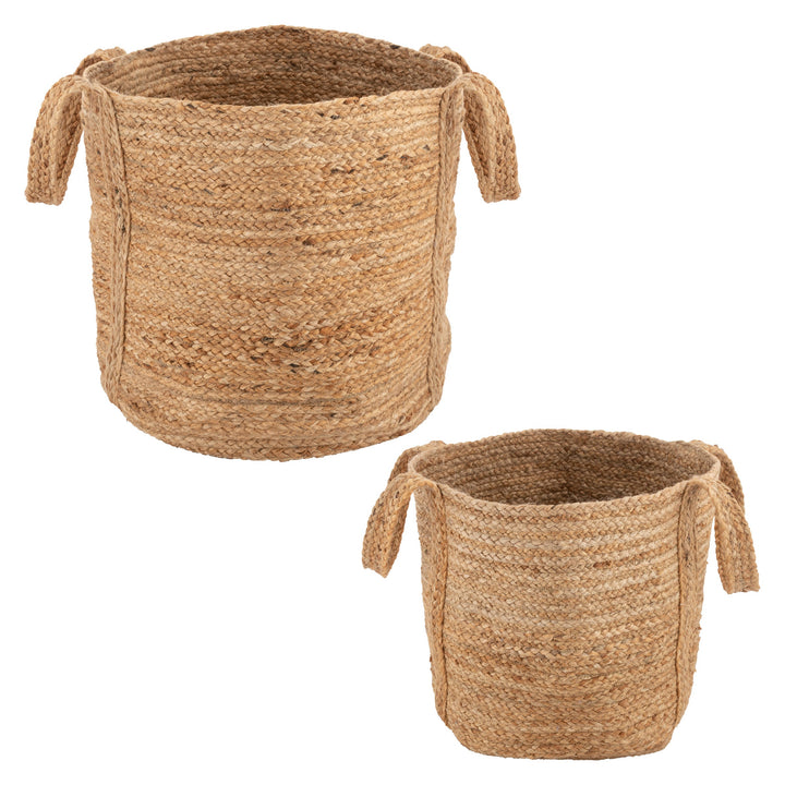 Sobre este producto: Nuestras Cestas de yute trenzado son el complemento perfecto, rústico y atemporal para tu hogar. Ya sea que se utilicen para sostener plantas altas o toallas y mantas, estas cestas de yute sirven como una pieza de decoración del hogar elegante y funcional. Estas cestas también vienen en un juego de dos con asas tejidas de yute. Quedan muy bien juntas o colgadas en una escalera o estantería de la sala de estar. Diseña tu hogar a partir de la inspiración que aportan estas elegantes cestas.Juego de 2 cestas de tamaños distintos
