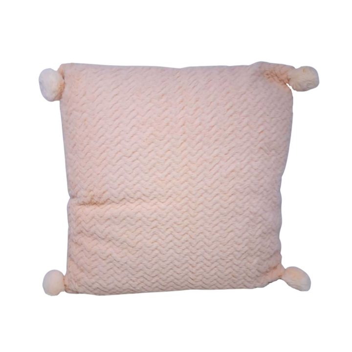 Sobre este producto: Cojín decorativo Beige con pompones en las esquinas: un complemento ideal para añadir ternura, calidez y un toque bohemio a cualquier ambiente.Este cojín destaca por su diseño acogedor y encantador: confeccionado en un tejido mullido de apariencia textil delicada y rematado con pequeños pompones en cada esquina, que realzan su carácter lúdico y chic.