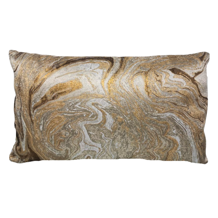 Sobre este producto: Este elegante cojín decorativo combina tonos dorados con matices blancos y arena en un patrón marmoleado de remolinos fluidos. Su inconfundible diseño evoca la belleza natural del mármol y añade un toque de sofisticación artística a cualquier espacio. Ideal para romper la monotonía en salones, dormitorios o zonas de descanso, este cojín fusiona arte y confort en una sola pieza.