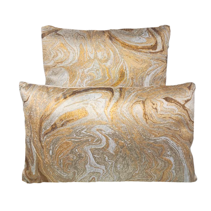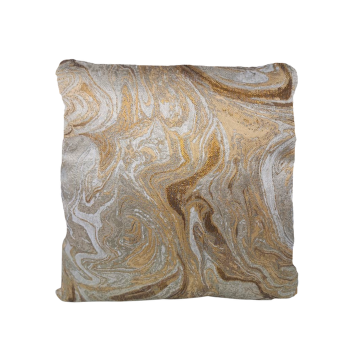 Sobre este producto: Este elegante cojín decorativo combina tonos dorados con matices blancos y arena en un patrón marmoleado de remolinos fluidos. Su inconfundible diseño evoca la belleza natural del mármol y añade un toque de sofisticación artística a cualquier espacio. Ideal para romper la monotonía en salones, dormitorios o zonas de descanso, este cojín fusiona arte y confort en una sola pieza.