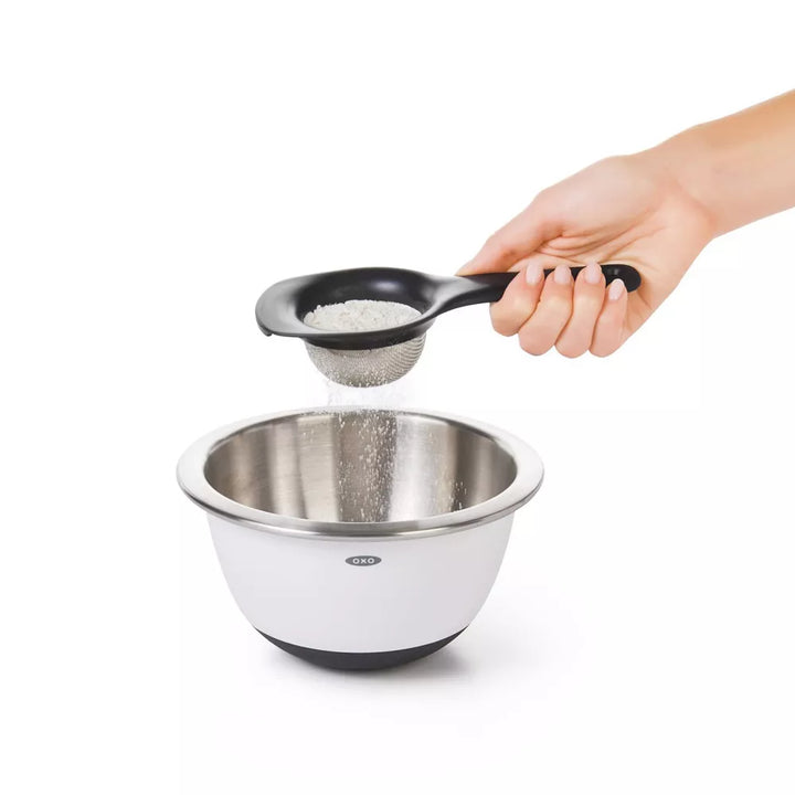 Sobre este producto: Este practico de colador con malla fina es ideal para filtrar jugos cítricos, espolvorear azúcar glass, preparar té de hojas sueltas, entre otros usos. Su diseño incluye una base de acero inoxidable con estructura de doble varilla para mayor firmeza, un gancho para equilibrarlo sobre tazas o cuencos, y un mango antideslizante que se mantiene firme incluso cuando está mojado. Es apto para lavavajillas.
