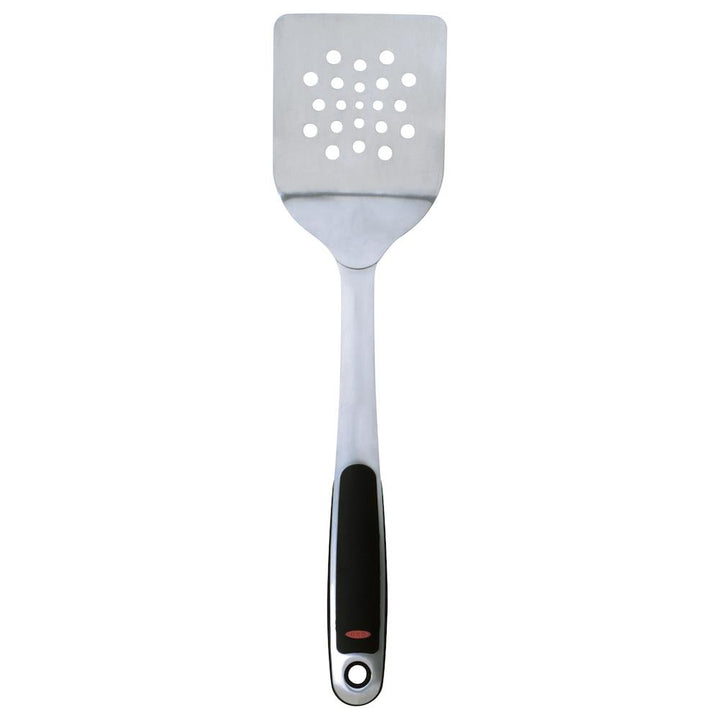 Sobre este producto: Espátula ranurada, 14", acero inoxidable. Cabezal de acero inoxidable elegante y fácil de usar. Mango de acero inoxidable cepillado con agarre suave para mayor comodidad.