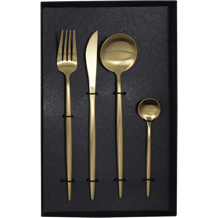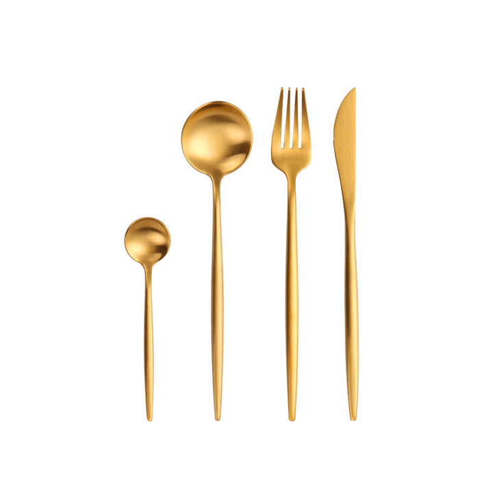 Sobre este producto: Dale un toque de sofisticación a tu mesa con este exclusivo set de cubiertos dorados. Su diseño moderno y acabado mate en tono oro hacen de cada comida una experiencia de elegancia y estilo.