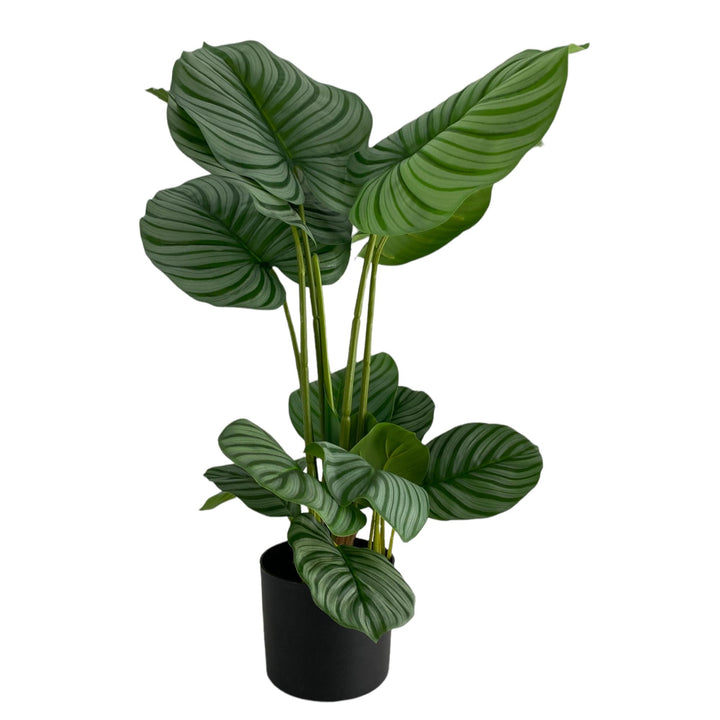 Sobre este producto: Transforma cualquier espacio con esta imponente planta artificial de estilo tropical, inspirada en la belleza exótica de la Calathea orbifolia. Sus grandes hojas verdes con delicadas vetas plateadas reproducen a la perfección la estructura y textura de la especie real. Todo ello sin necesidad de luz natural, riego ni cuidados. Ideal para quienes desean introducir lo decorativo sin complicaciones.
