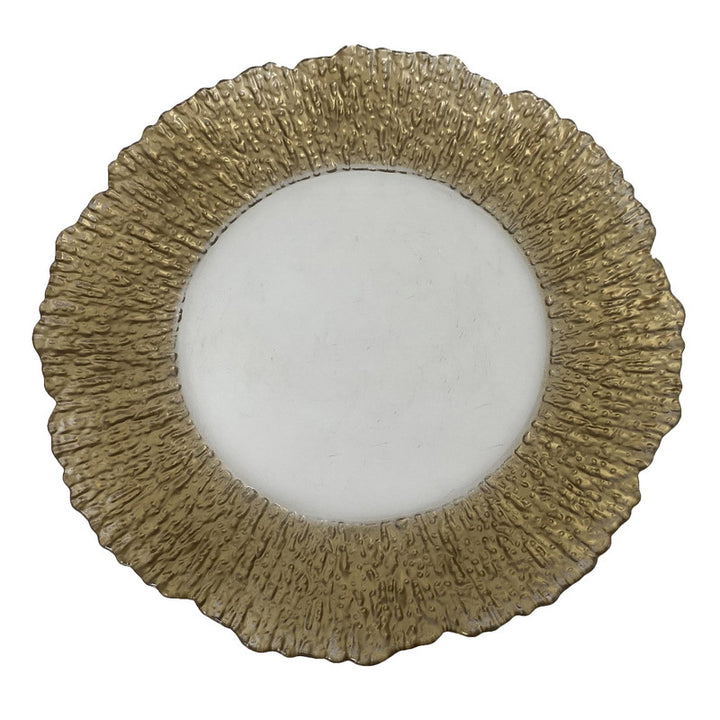 Sobre este producto: Este elegante porta platos presenta un diseño redondo con un impresionante borde dorado que simula una textura erosionada o coralina, aportando un toque sofisticado y artesanal. La superficie central, de tono neutro o blanco desgastado, permite destacar cualquier vajilla que coloques encima, creando un contraste refinado y llamativo.