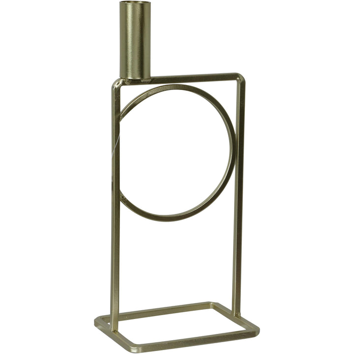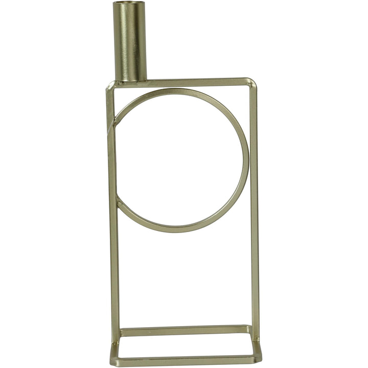 Sobre este producto: Este portavelas combina líneas puras y formas geométricas: un marco rectangular acoge un círculo central, mientras la parte superior sostiene una vela tipo taper. Fabricado en metal dorado, no solo sirve para iluminar, sino que también actúa como una pieza decorativa contemporánea.