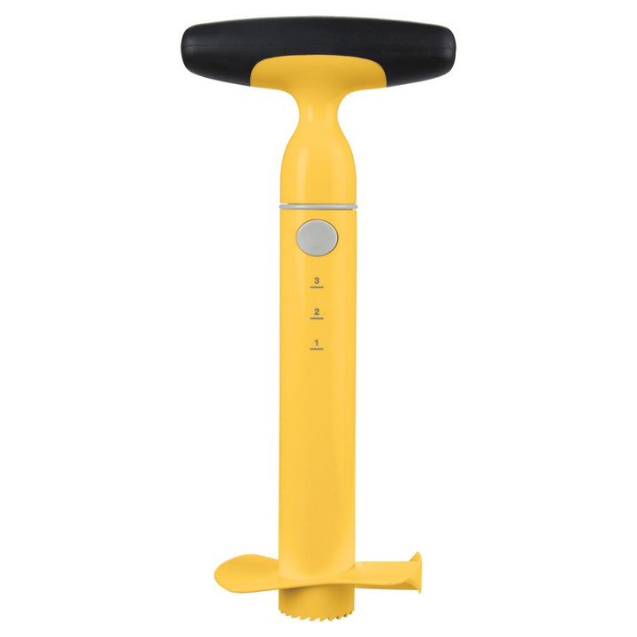 Sobre este producto: La cortadora de piña OXO Good Grips descorazona y corta una piña entera de forma rápida y sencilla. Simplemente corte la parte superior de una piña fresca y gire la cortadora sobre la fruta expuesta para crear anillos de piña perfectos. El mango de trinquete facilita el descorazonado rápido de las piñas sin tener que quitar y reemplazar la mano con cada giro. Las marcas de medición en la rebanadora determinan la altura de la piña antes de cortarla para que sepa cuándo la rebanadora está a punto de llegar al fondo de la fruta. Esta característica asegura una cáscara de piña intacta para rellenar con ensalada de frutas o un cóctel festivo si lo desea. La perilla giratoria cuenta con un agarre suave, cómodo y antideslizante y se separa del eje para facilitar la limpieza. La cuchilla afilada y de tamaño mediano fue diseñada para adaptarse a la mayoría de los tamaños de piña y su forma compacta hace que sea fácil de almacenar cuando no está en uso.