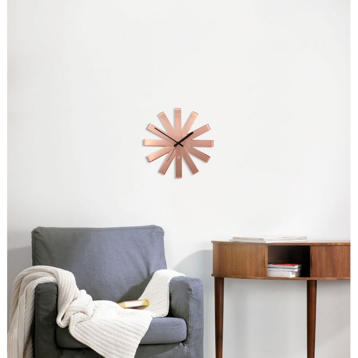 Sobre este producto: Ribbon de Umbra es un moderno reloj de pared fabricado en acero pulido. Su diseño cortado y la combinación de colores lo convierten en un reloj ideal para cocinas y ambientes vanguardistas.