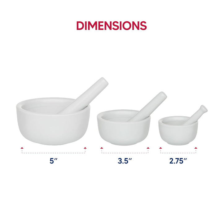 Sobre este producto: Juego de mortero de porcelana fina de 3 piezas de HIC Kitchen para moler artículos hasta convertirlos en una pasta fina o polvo,Hecho de porcelana de alta calidad; libre de plomo y cadmio; El juego incluye 3 morteros (2.75 pulgadas, 3.5 pulgadas y 5 pulgadas) con morteros a juego,Prepara aderezos secos aromáticos, pastas de curry, pestos, mantequillas de frutos secos, canela molida o granos de pimienta molidos, prepara remedios ,Duradero; seguro para congelador, microondas, horno, asador (hasta 350 grados Fahrenheit); Apto para lavavajillas para facilitar la limpieza