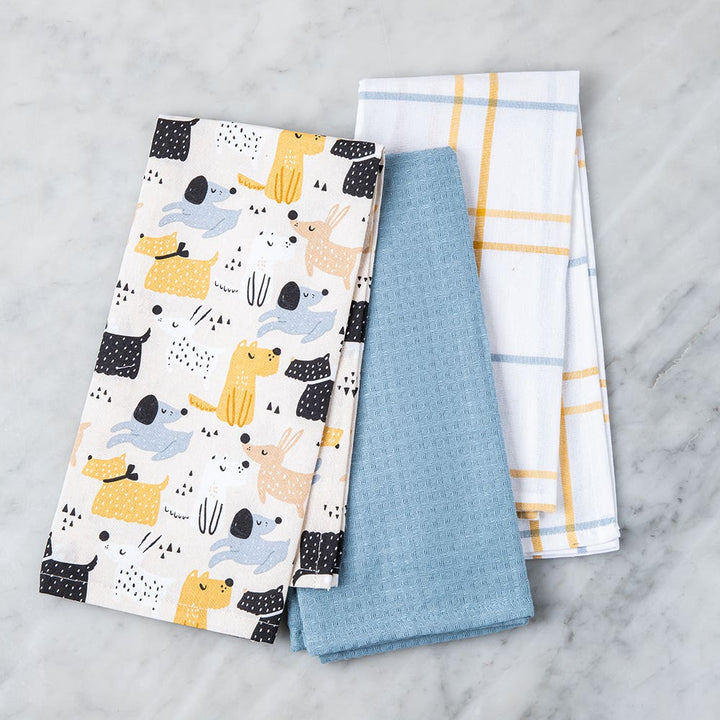 Sobre este producto: Estas hermosas toallas de cocina Combo de algodón son perfectas para secar platos, atender tu bar o como acento decorativo en tu cocina. Fabricadas con 100?% algodón extra suave, este juego de 3 toallas "Dogs" es ideal para amantes de los perros y muy útil para cualquier tarea.