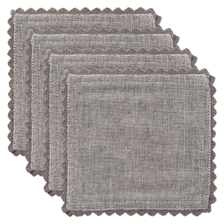 Sobre este producto: Estos posavasos de tela gris Nepal elevan tu mesa o sala de estar con un diseño neutro y elegante. Fabricados en suave algodón y acentuados con un ribete de encaje, este juego de cuatro posavasos mantendrá tus mesas protegidas y tu hogar con un aspecto elegante. Con un tamaño de 5" x 5" y fáciles de limpiar (lavar y secar a máquina) estos posavasos son una adición fácil y sencilla a su espacio para mantener el orden.