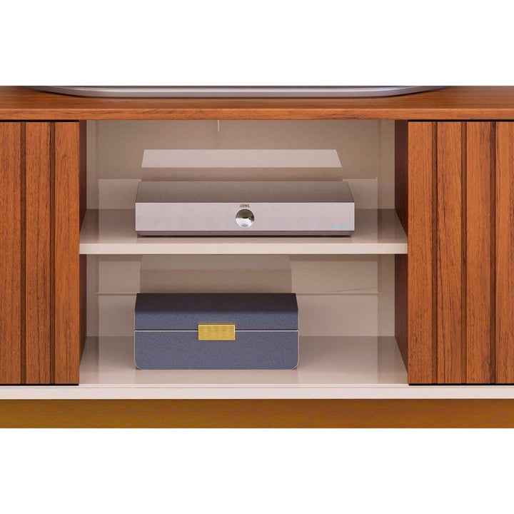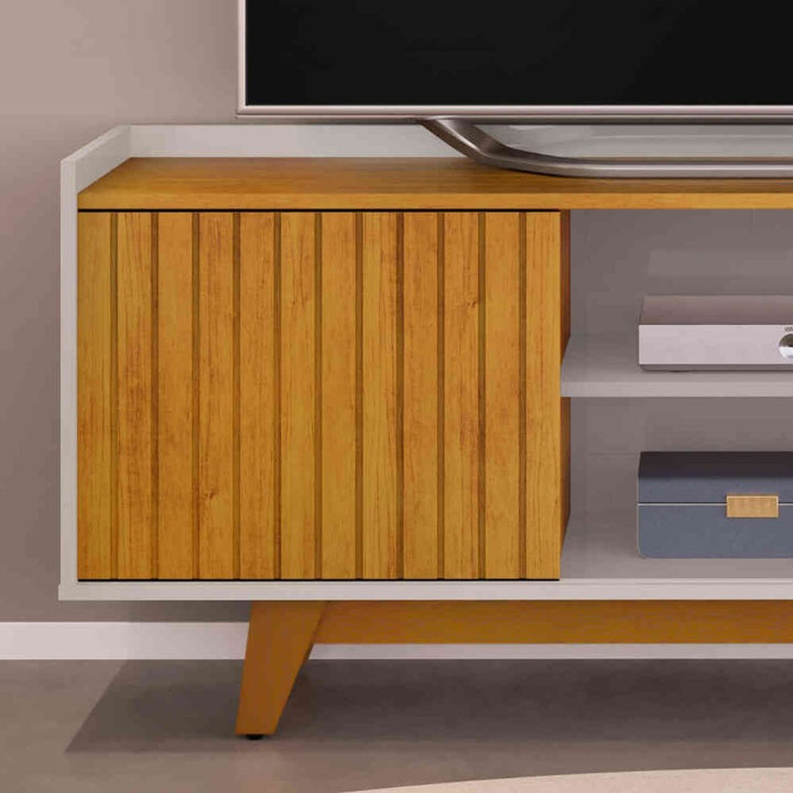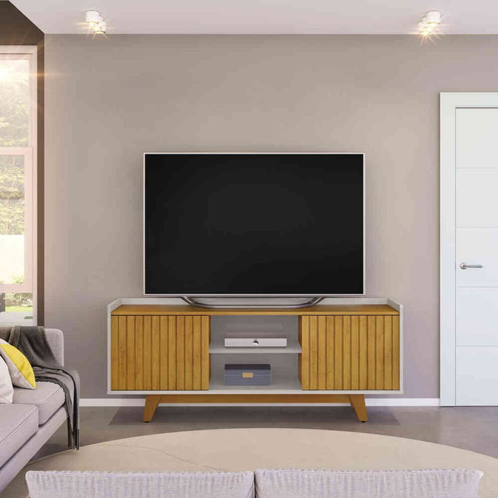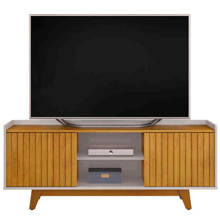Sobre este producto: El Rack Flat trae las tendencias de diseño más actuales, con un diseño moderno. Para guardar tus objetos, cuenta con dos amplias puertas correderas con frisos decorativos. El banco también tiene dos espacios para dispositivos electrónicos entre las puertas, asegurando lo mejor de entretenimiento